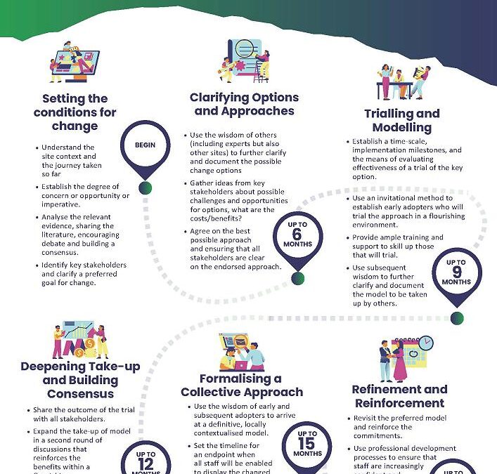 The Excellent Schools model not only outlines these steps at embedding change but also how to reinforce the collective agreements in ways that make them future-proof, particularly in schools with large numbers of teachers or high staff turnover. At the same time, it reinforces that induction processes for new staff are clear about the embedded approach and the ways that they will be supported to adopt this.