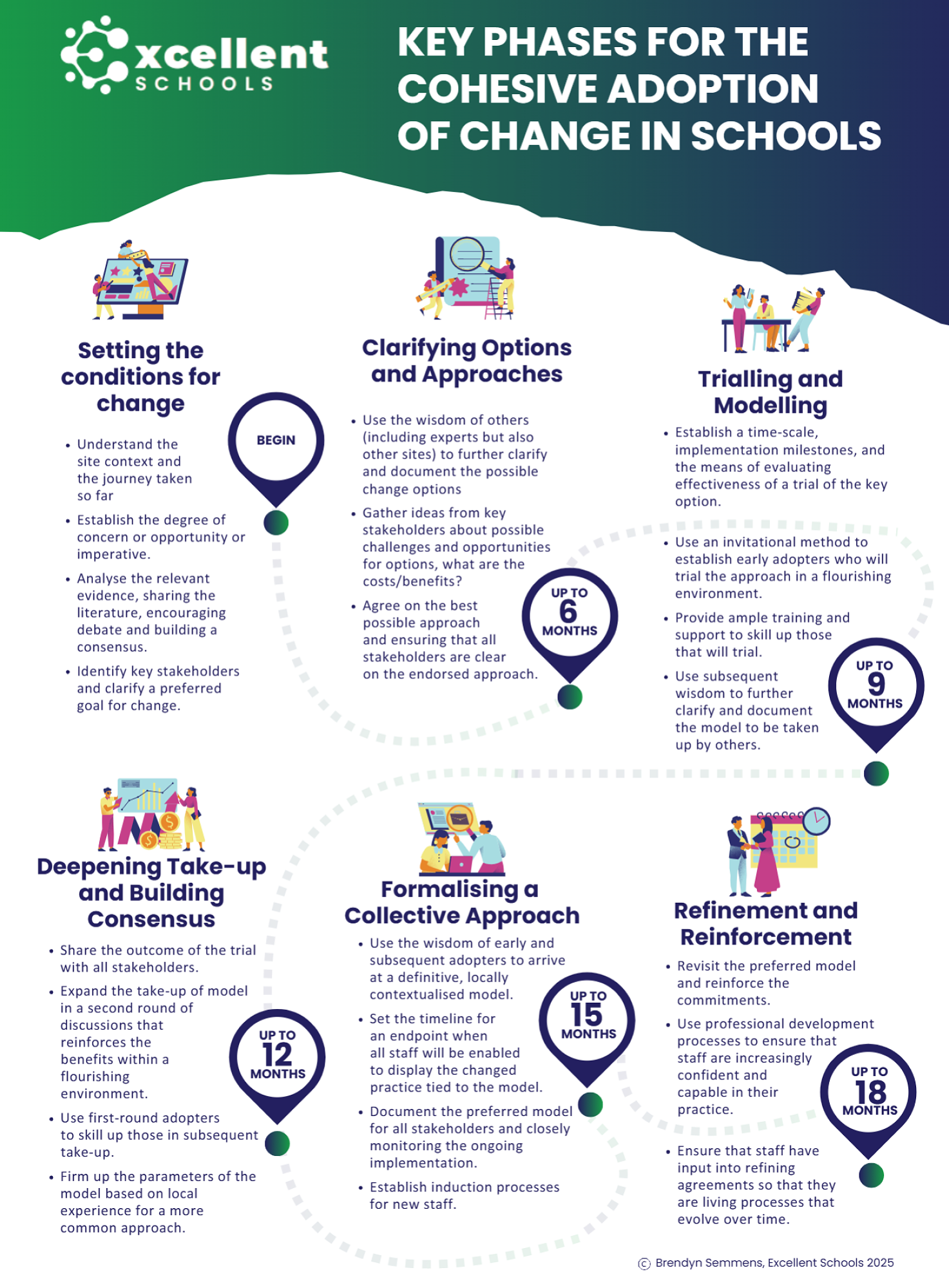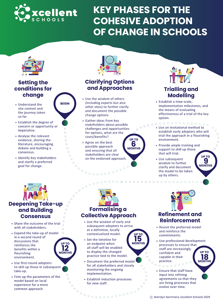 The Excellent Schools model not only outlines these steps at embedding change but also how to reinforce the collective agreements in ways that make them future-proof, particularly in schools with large numbers of teachers or high staff turnover. At the same time, it reinforces that induction processes for new staff are clear about the embedded approach and the ways that they will be supported to adopt this.